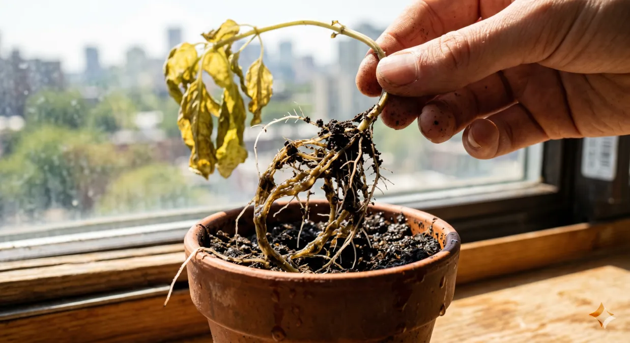 O problema é que raízes encharcadas apodrecem. E uma vez que a raiz apodrece, a planta não tem mais como absorver nutrientes de jeito nenhum — mesmo que o solo esteja cheio deles.